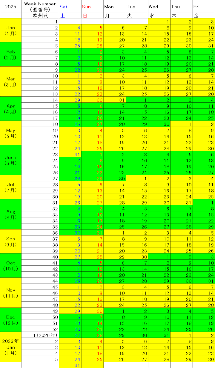 2025年は、スタートとなる週が「ヨーロッパ」と「アメリカ、日本、中国」で合致しているものの、その範囲がずれています。「アメリカ、日本、中国」ではどのような場合でも1月1日を含む週がWeek 1となる第1週ですが、ヨーロッパではその年の最初の木曜日を含む週(もしくは1月4日を含む週)がWeek 1となりますので、2025年の最初の木曜が1月2日となるのでこの日を含む週がWeek 1となります。