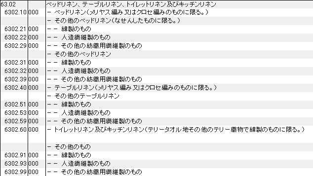 HSコードのうち「6302 ベッドリネン、テーブルリネン、トイレットリネン、キッチンリネン」のカテゴリーに入る、6ケタ、9ケタ細分類のHSコードと品名の詳細一覧です。