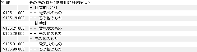 HSコードのうち「9105 その他の時計」のカテゴリーに入る、6ケタ、9ケタ細分類のHSコードと品名の詳細一覧です。